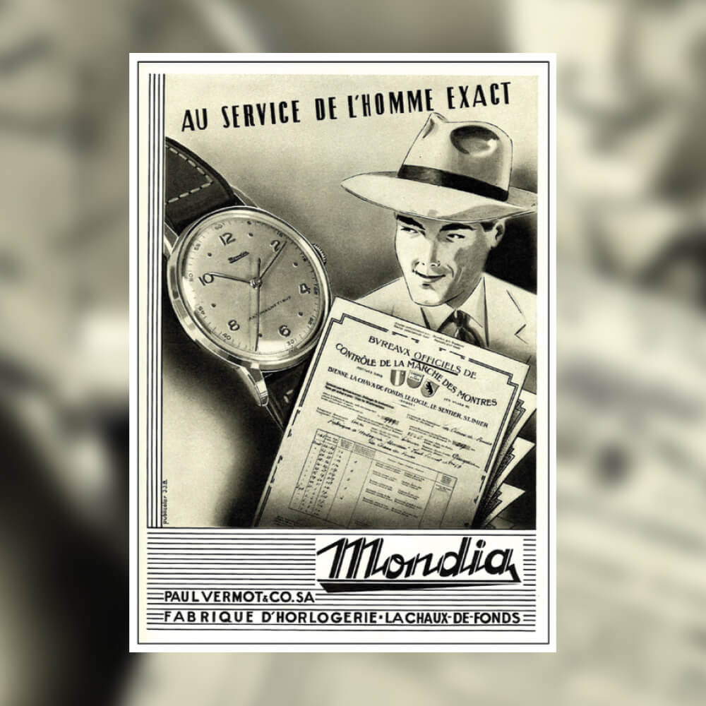 The Origins. In 1935, in the heart of Le Locle, the cradle of Swiss watchmaking, Paul Vermot decided to make his dream come true: he officially registe- red the Mondia brand. The first watches he created were mechanical, hand-wound with steel or gold cases and elegant, minimalist dials, small precision jewels that told the time with understated elegance. In the 1940s, Mondia began to make a name for itself beyond the borders of Switzerland. The company expanded into Europe, winning over enthusiasts with automatic watches and chronographs, combining technical innovation and refined style. The models bore the influence of Art Deco and military aesthetics, harmonising classic lines and functionality. Thus, step by step, Mondia established itself as a brand that not only measured time, but told a story of tradition, ingenuity and Swiss passion.